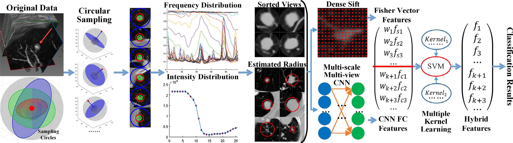 In this paper, we propose a novel classification method for lung nodules from CT images based on hybrid features. Towards nodules of different types, including well-circumscribed, vascularized, juxta-pleural, pleural-tail, as well as ground glass optical (GGO) and non-nodule from CT scans, our method has achieved promising classification results. The proposed method utilizes hybrid descriptors consisting of statistical features from multi-view multi-scale convolutional neural networks (CNNs) and geometrical features from Fisher vector (FV) encodings based on scale-invariant feature transform (SIFT). First, we approximate the nodule radii based on icosahedron sampling and intensity analysis. Then, we apply high frequency content measure analysis to obtain sampling views with more abundant information. After that, based on re-sampled views, we train multi-view multi-scale CNNs to extract statistical features and calculate FV encodings as geometrical features. Finally, we achieve hybrid features by merging statistical and geometrical features based on multiple kernel learning (MKL) and classify nodule types through a multi-class support vector machine. The experiments on LIDC-IDRI and ELCAP have shown that our method has achieved promising results and can be of great assistance for radiologists’ diagnosis of lung cancer in clinical practice.
