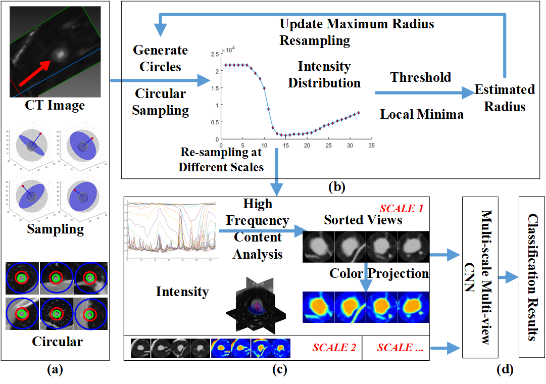 In this paper, we propose a novel convolution neural networks (CNNs) based method for nodule type classification. Compared with classical approaches that are handling four solid nodule types, i.e., well-circumscribed, vascularized, juxta- pleural and pleural-tail, our method could also achieve competitive classification rates on ground glass optical (GGO) nodules and non-nodules in computed to- mography (CT) scans. The proposed method is based on multi-view multi-scale CNNs and comprises four main stages. First, we approximate the spherical sur- face centered at nodules using icosahedra and capture normalized sampling for CT values on each circular plane at a given maximum radius. Second, intensi- ty analysis is applied based on the sampled values to achieve estimated radius for each nodule. Third, the re-sampling (which is the same as the first step but with estimated radius) is conducted, followed by a high frequency content measure analysis to decide which planes (views) are more abundant in infor- mation. Finally, with approximated radius and sorted circular planes, we build nodule captures at sorted scales and views to first pre-train a view independent CNNs model and then train a multi-view CNNs model with maximum pooling. The experimental results on both Lung Image Database Consortium and Image Database Resource Initiative (LIDC-IDRI) [1] and Early Lung Cancer Action Program(ELCAP) [2] have shown the promising classification performance even with complex GGO and non-nodule types.
